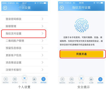 3、開通步驟:在手機銀行“個人設置”中選擇“指紋支付設置”進入指紋設置流程,依次驗證通過您的指紋信息、任意借記卡(或活期一本通)交易密碼、短信驗證碼后即開通了指紋支付;您可以根據需要隨時關閉或者打開指紋支付。