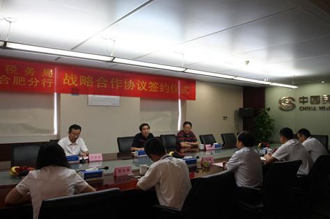 6月5日,安徽省地方稅務局與合肥分行“銀稅互動”戰略合作協議簽約儀式在分行四樓會議室成功舉行。省地稅局黨組成員、政治部主任鄭聖良和合肥分行副 行長週飚代表雙方簽訂協議,安徽省地稅局納稅服務處(大企業稅收管理處)處長金啟鐘、安徽省地稅局納稅服務處(大企業稅收管理處)科長呂春雷、合肥分行小 微規劃與營銷策劃部負責人屠其俊、科技部負責人李冰、小微及小區風險管理部負責人金懿、售后服務管理部負責人施旻等出席了簽約儀式。