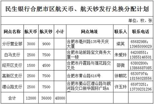民生銀行合肥市區航天幣、航天鈔發行兌換分配計劃