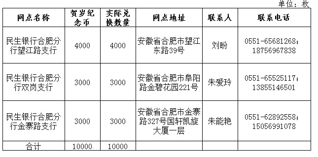 民生銀行合肥市區2016年賀歲普通紀念幣發行實際兌換數量