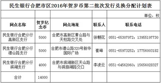 民生銀行合肥市區2016年賀歲幣第二批次發行兌換分配計劃表